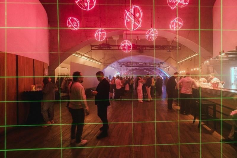 Особая атмосфера окутывала гостей уже с первых минут праздника: чтоб попасть на «космический корабль» им предстояло пройти сквозь лазерную решетку, которая, фактически стала первой фотозоной. Всем желающим предлагали дополнить космический образ неоновым украшением. Главная фотозона была выполнена в виде лунного пейзажа, на небосклоне которого видна планета AMS и сияли ее звезды.