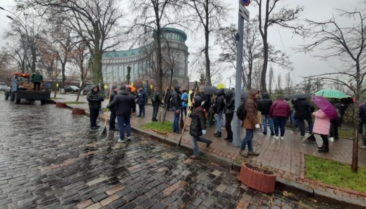 Они убирали территорию мемориального комплекса от верхнего выхода метро «Крещатик» до памятной стелы погибшим участникам Революции Достоинства.