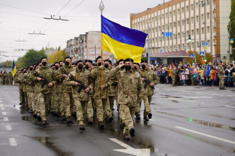 Торжественным маршем по главной площади Северодонецка – площади Победы – прошли более тысячи защитников и защитниц Родины: военнослужащих, спасателей, полицейских, представителей других силовых структур и ведомств.