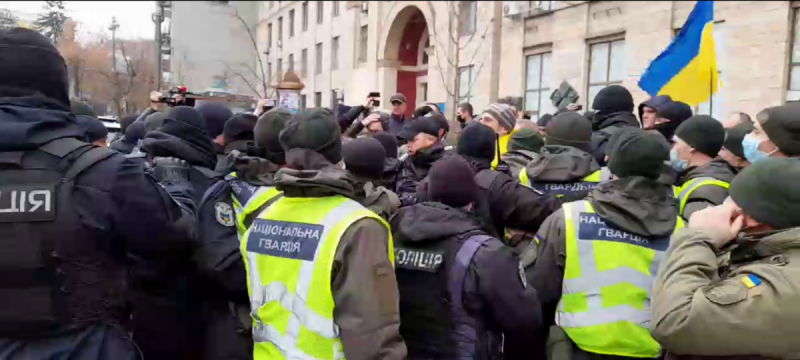 В Киеве около сотни перевозчиков пытались заблокировать движение транспорта на улице Грушевского, протестуя против новых правил перевозки пассажиров.