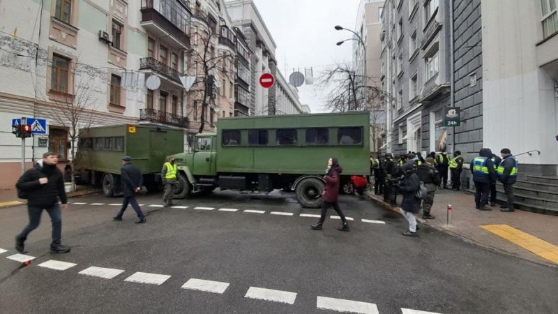 Выезды на Грушевского заблокированы полицейскими грузовиками.
