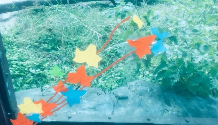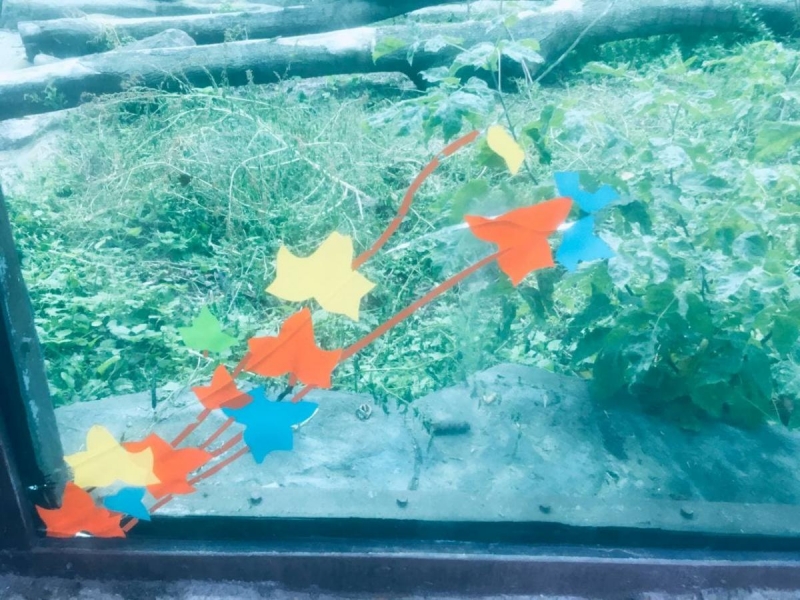 На фотографиях видно, что стекло вольера укрыто трещинами. А чтобы они не сильно бросались в глаза, на них наложили цветные аппликации.