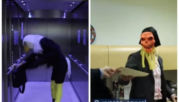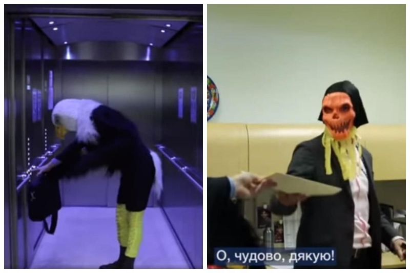 После этого сотрудник посольства в костюме орлана заходит в кабинет коллеги, который пьет кофе из чашки с надписью «Stop Fake». Мужчина в маске птицы вручает сотруднику, который нарядился зловещим Фонарем Джеком (вырезанная голова тыквы), отчет от российской дезинформации.