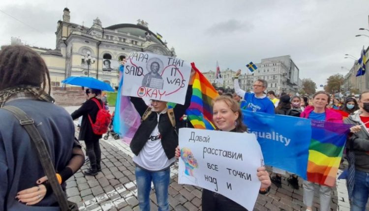 На перекрестке улиц Владимирской и Богдана Хмельницкого в Киеве с утра собрались участники марша равенства — ЛГБТ-активисты. В то же время возле университета Шевченко вышли их оппоненты, противники марша.