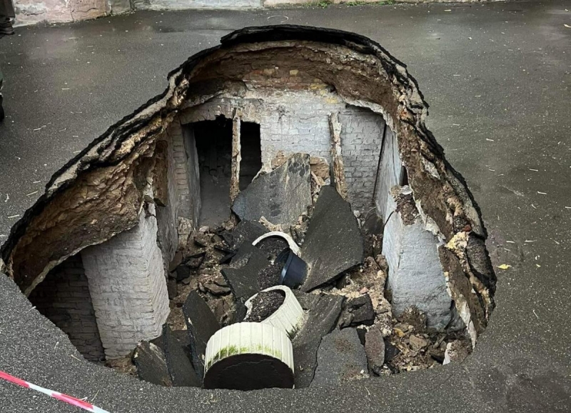 На придомовой территории по улице Малая Житомирская в Киеве асфальтовое покрытие провалилось в подвал, размещение которого озадачило пользователей сети.