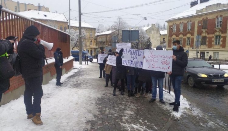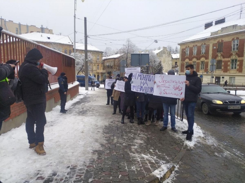 Более трех десятков митингующих собрались сегодня возле консульства Польши во Львове в знак протеста против повторного избрания польской рекрутинговой компании победителем тендера по оформлению виз.
